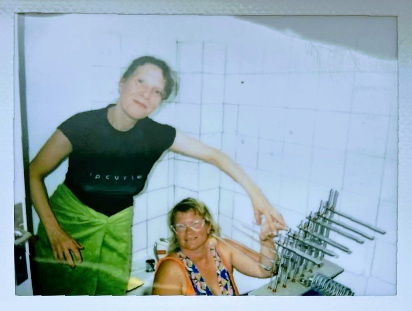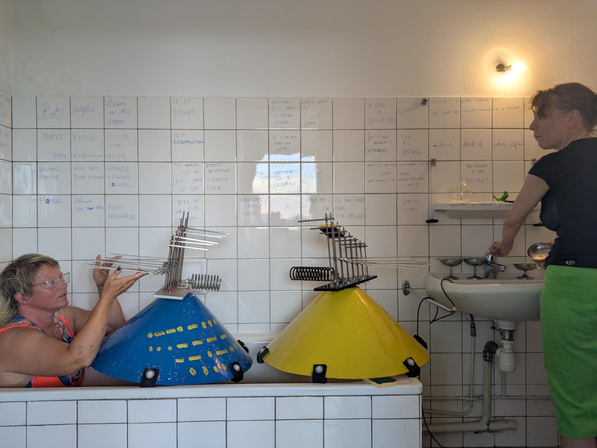 The KunschTTurm Club was located in the Kunstturm, a 100 m² apartment, on the 22nd floor of the Tour de l’Europe in Mulhouse. Made available by its owners, the club quickly became a second studio for the Alsace branch of ∏-Node. Julia and Dinah bubbled up the closing weekend. Armed with their cristal Baschets, they pulled the plug from the heat in the bathroom for a 2 hours improvised installation/performance. Inspired by Anne Carson’s poem ‘Guillermo’s Sigh Symphony‘ (2002) which was copied onto the tiled walls, ears steaming near the bath tub of sounds, the audience drifted in and out. The “souffleuses de son” captured FM radio through the pipes, read extracts from the poem, and used hydrophones and small radios to amplify the drip, drip, dripping.