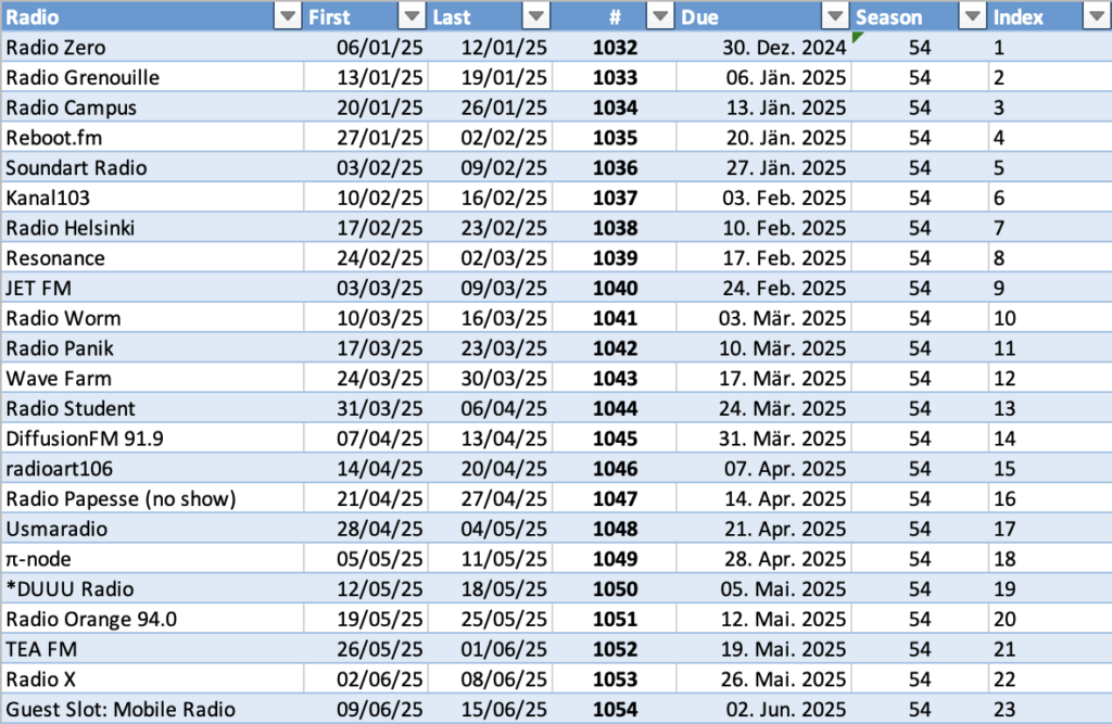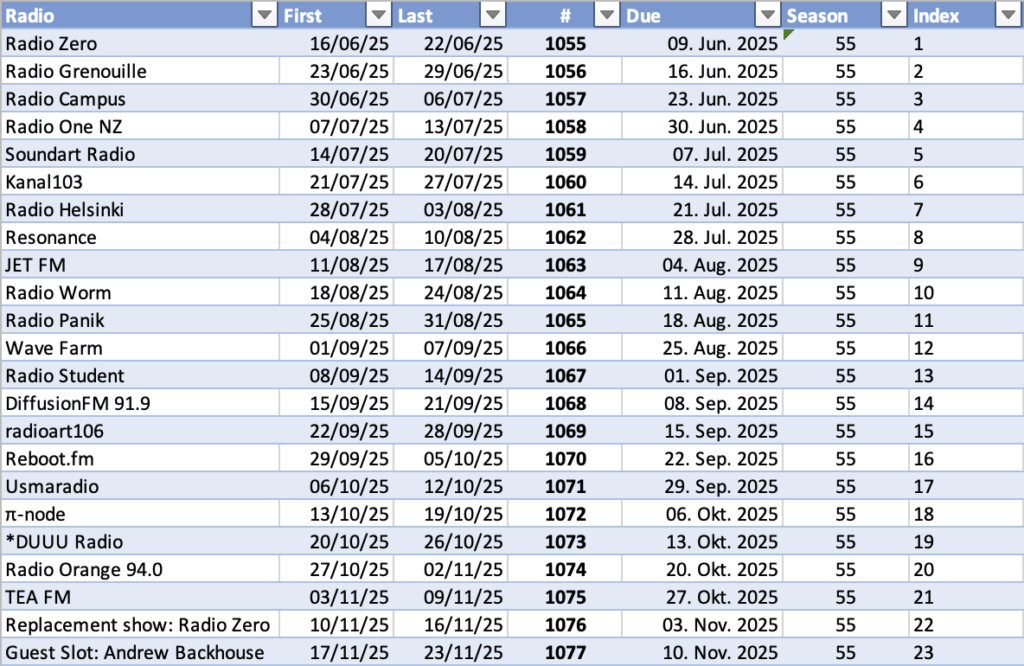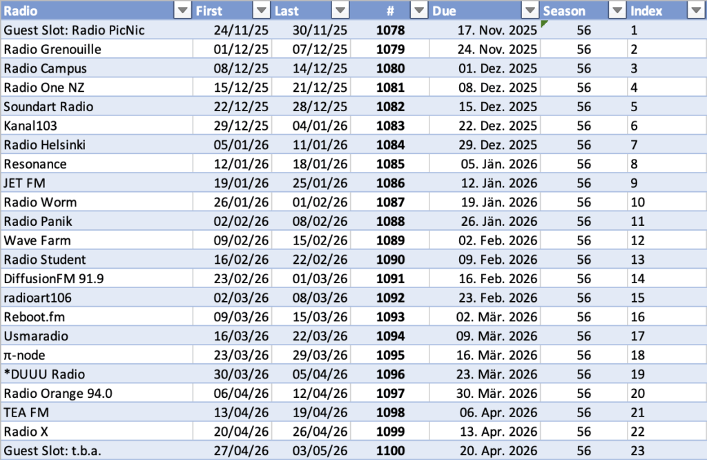 season 42: RADIO FIRST LAST # DUE Radio Grenouille 11/02/19 > 17/02/19 (show #724) ... 04. Feb. 2019 Radio Campus ... 18/02/19 > 24/02/19 (show #725) ... 11. Feb. 2019 Soundart Radio . 25/02/19 > 03/03/19 (show #726) ... 18. Feb. 2019 Radio Zero ..... 04/03/19 > 10/03/19 (show #727) ... 25. Feb. 2019 Kanal103 ....... 11/03/19 > 17/03/19 (show #728) ... 04. Mär. 2019 Resonance ...... 18/03/19 > 24/03/19 (show #729) ... 11. Mär. 2019 Radio Helsinki . 25/03/19 > 31/03/19 (show #730) ... 18. Mär. 2019 Radio Papesse .. 01/04/19 > 07/04/19 (show #731) ... 25. Mär. 2019 JET FM ......... 08/04/19 > 14/04/19 (show #732) ... 01. Apr. 2019 Radio X ........ 15/04/19 > 21/04/19 (show #733) ... 08. Apr. 2019 Radio One NZ ... 22/04/19 > 28/04/19 (show #734) ... 15. Apr. 2019 Campus Paris ... 29/04/19 > 05/05/19 (show #735) ... 22. Apr. 2019 CFRC ........... 06/05/19 > 12/05/19 (show #736) ... 29. Apr. 2019 Radio Corax .... 13/05/19 > 19/05/19 (show #737) ... 06. Mai. 2019 ORANGE ......... 20/05/19 > 26/05/19 (show #738) ... 13. Mai. 2019 Radio Worm ..... 27/05/19 > 02/06/19 (show #739) ... 20. Mai. 2019 Radio Panik .... 03/06/19 > 09/06/19 (show #740) ... 27. Mai. 2019 TEA FM ......... 10/06/19 > 16/06/19 (show #741) ... 03. Jun. 2019 Wave Farm ...... 17/06/19 > 23/06/19 (show #742) ... 10. Jun. 2019 Radio Student .. 24/06/19 > 30/06/19 (show #743) ... 17. Jun. 2019 Reboot.fm ...... 01/07/19 > 07/07/19 (show #744) ... no show DiffusionFM 91.9 08/07/19 > 14/07/19 (show #745) ... 01. Jul. 2019 radioart106 .... 15/07/19 > 21/07/19 (show #746) ... 08. Jul. 2019 Usmaradio ...... 22/07/19 > 28/07/19 (show #747) ... 15. Jul. 2019 Radio ARA ...... 29/07/19 > 04/08/19 (show #748) ... 22. Jul. 2019 CKUT ........... 05/08/19 > 11/08/19 (show #749) ... 29. Jul. 2019 gst: Radiofabrik 12/08/19 > 18/08/19 (show #750) ... 05. Aug. 2019